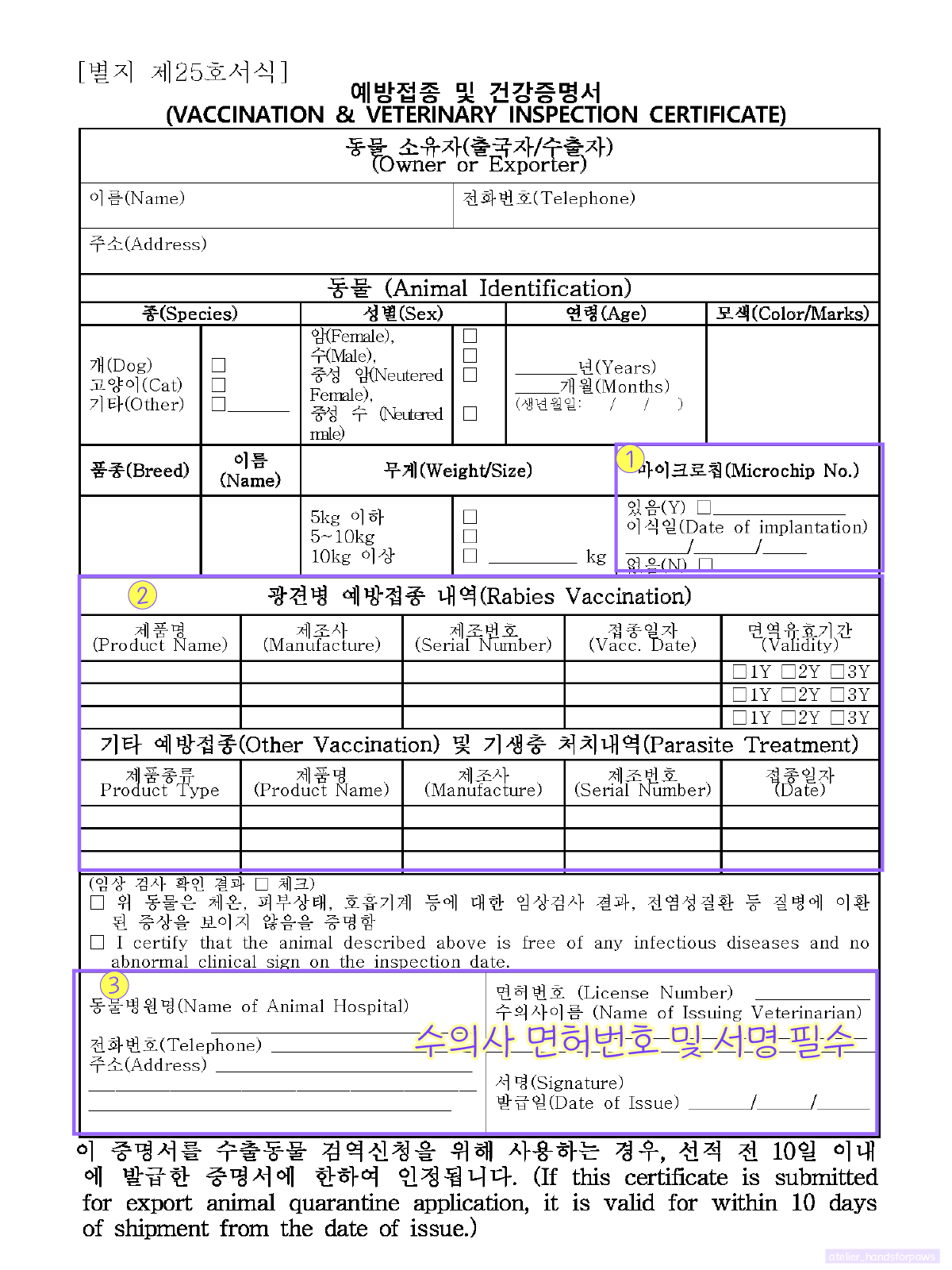 "예방접종 및 건강증명서" 서식은 아래와 같은데