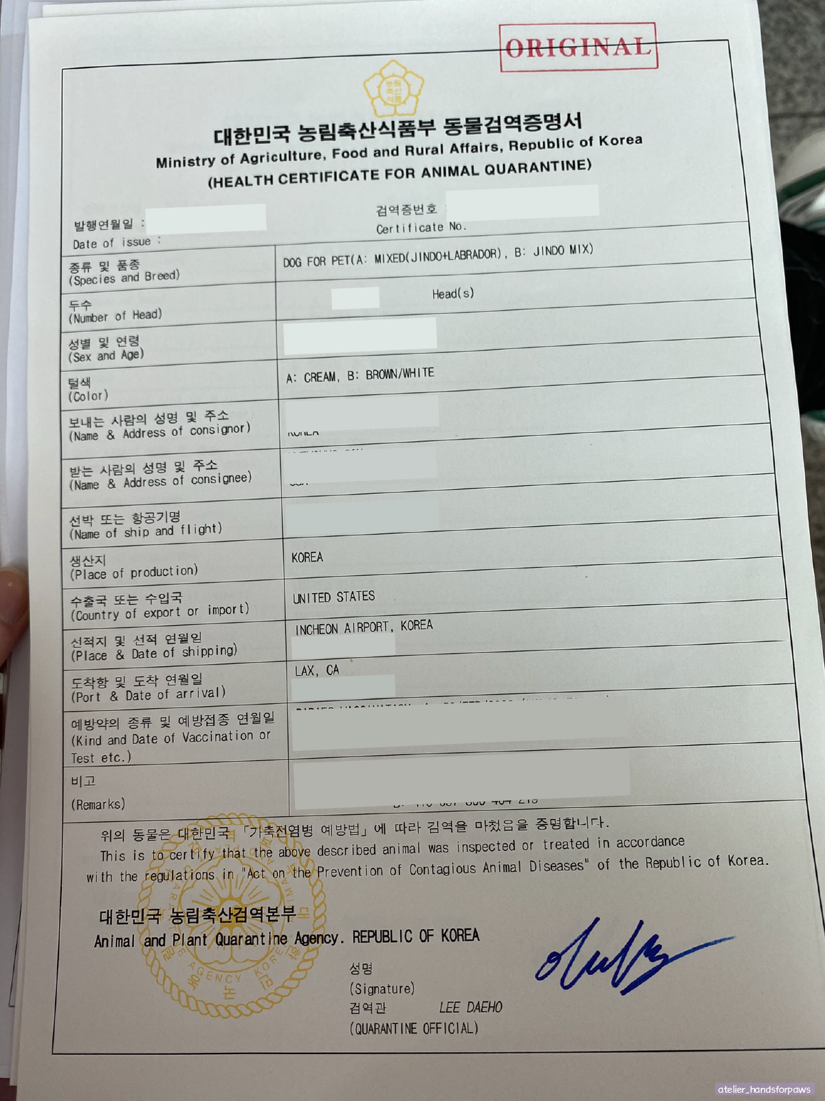 동물검역증명서 ORIGINAL과 DUPLICATE 2부를 발급해 주는데요