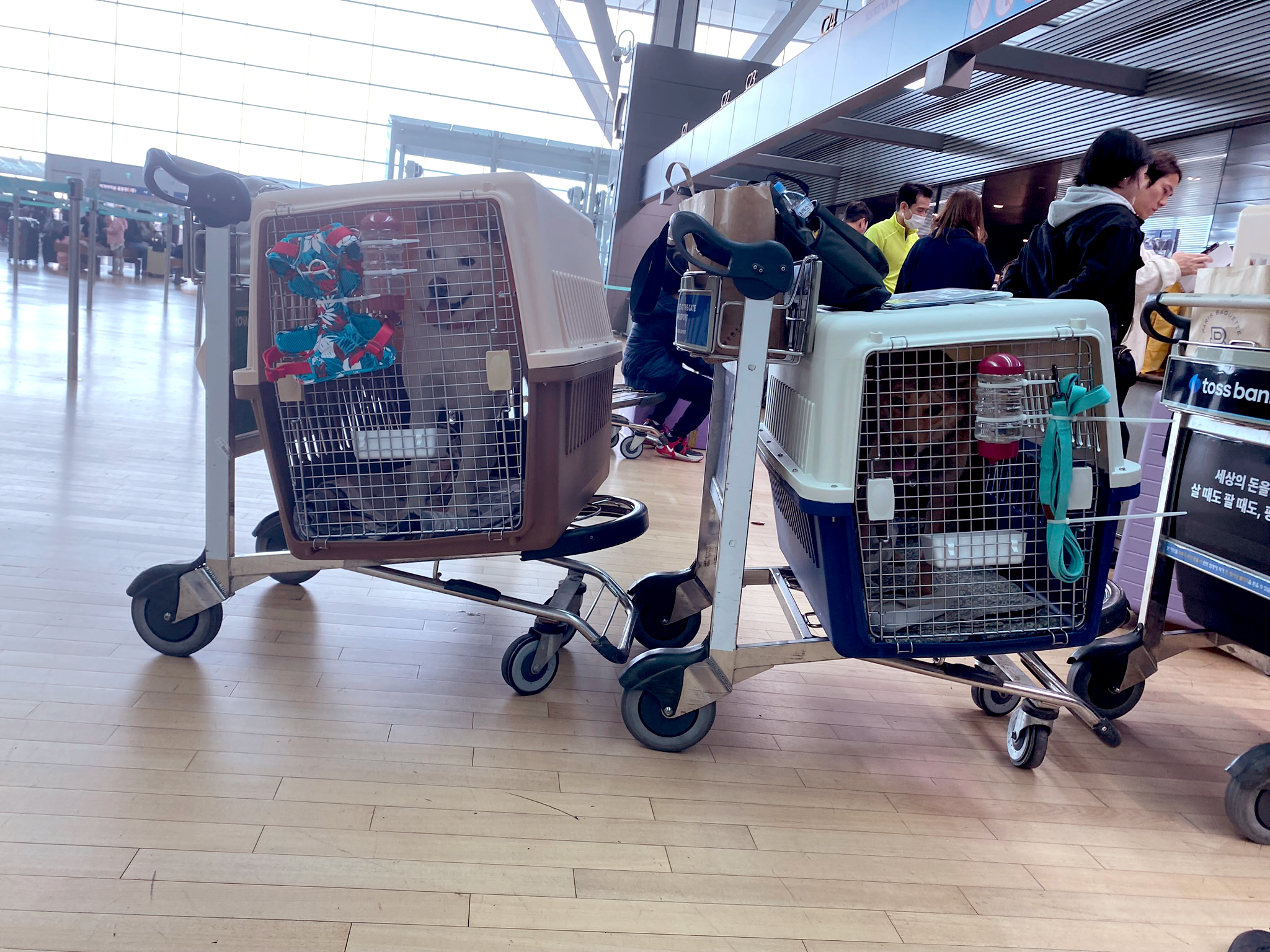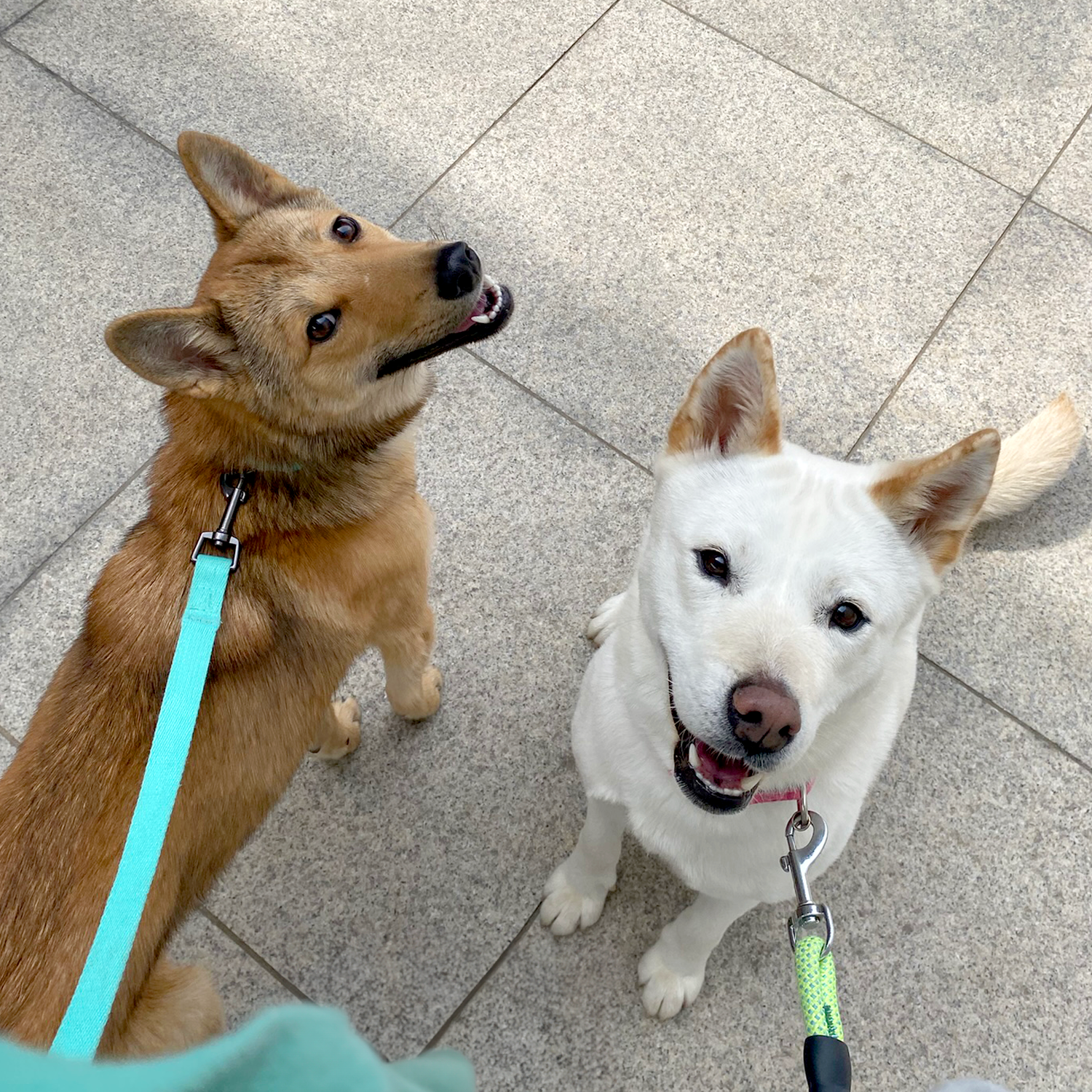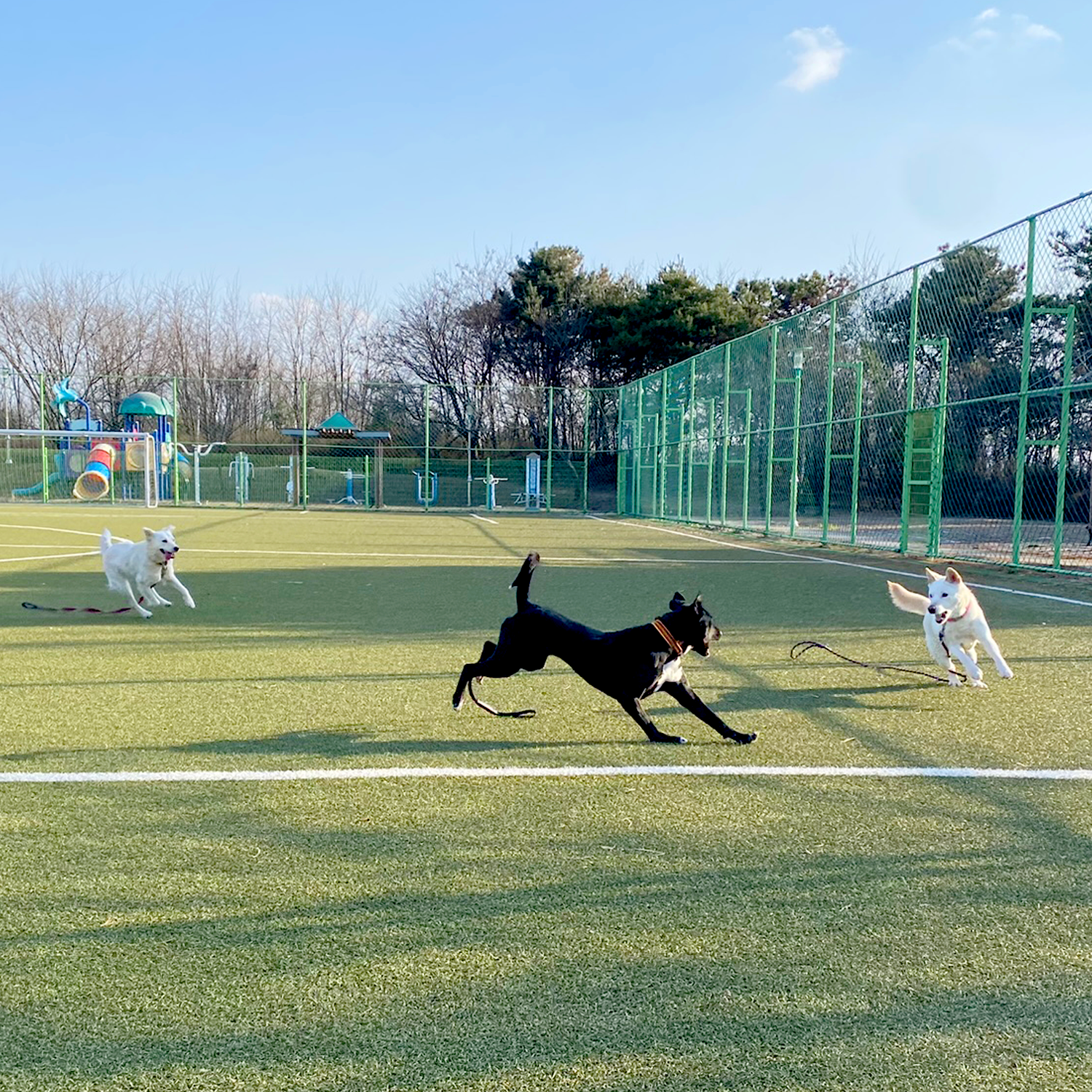 인천공항 제2터미널 잔디밭에서 산책 바바(왼쪽) 진(오른쪽)